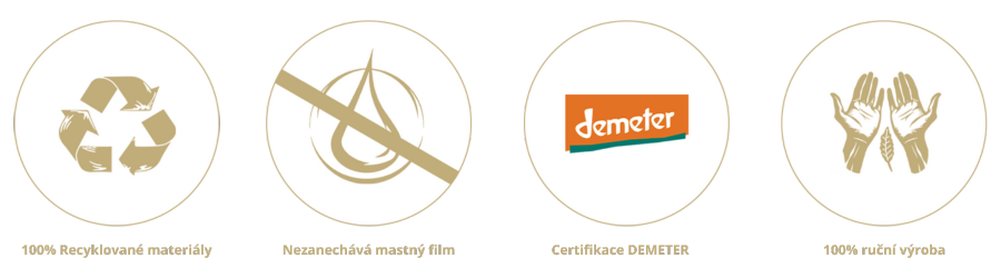 Bez palmového oleje, ropných derivátů (parafinů), parabenů, silikonů a pesticidů.