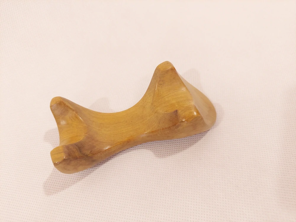 Na první pohled působí možná trochu jako dřevěná soška nebo abstraktní dekorace – ale když ji vezmete do ruky, pochopíte, že tohle je poctivý nástroj na hlubokou a cílenou masáž. Pomůcka je vyrobena z tvrdého dřeva a opatřena světlou lazurou, která zvýrazňuje kresbu a chrání materiál.
