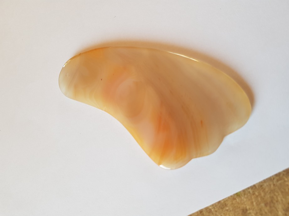 Opravdu velká gua sha destička v materiálu achátu a barvě takové oranžovo bílé, kdy fotka v textu je destička prosvícená světlem. Vhodná nejen na tělo ale také na obličej.