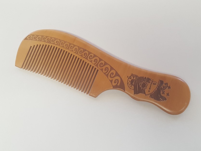 Dřevěný hřeben s motivem obličeje páva