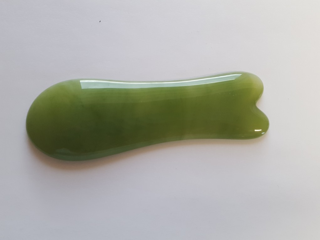 Gua sha destička v podobě rybičky. Materiálem je leštěná pryskyřice, která je zelená, avšak každá trochu jiná. V praxi velmi využívaná pomůcka. Můžete ji používat 2 - 5x denně, podle problému a podle potřeby. Vždy do zčervenání kůže, poté přestaňte a přesuňte se na jiné místo. Takže opět potřete místo na kůži olejem, a začnete přejíždět rybičkou tam a sem, popřípadě tlačte do bolestivých míst na dotek jejím ocasem až do povolení bolesti.