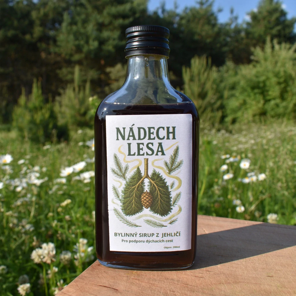 Vzniká tak glycerinová tinktura Nádech lesa – hutný bylinný extrakt s jemně sladkou chutí a kyselkavým, pryskyřičným lesním charakterem po jehličí. Je vytvořená pro chvíle, kdy jsou dýchací cesty citlivé, vzduch suchý a krk má tendenci „škrábat“ a dráždit k pokašlávání.