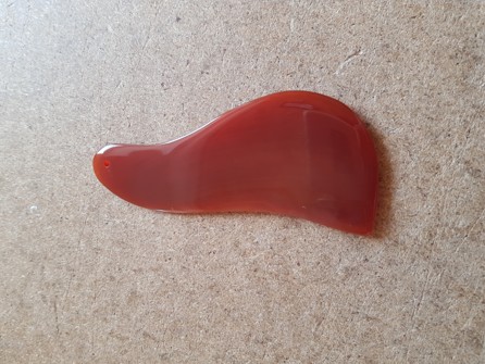 Gua sha destička, v mých očích tvar ptáčka :) Někdeo by řekl slza... Materiál - přírodní carnelian (polodrahokam sestávající z různých červených a oranžových chalcedonů - ale je to z číny, je možné, že to co uvádí, není originál :) V praxi velmi využívaná pomůcka.