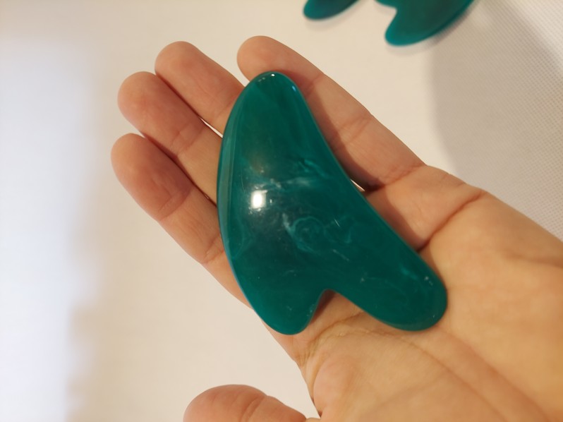 Destička ve tvaru kapky, materiálem je podle výrobce včelí vosk. Já bych řekla, že je to pryskyřice. Možná je tam nějaká příměs včelího vosku, kdo ví. Můžete ji použít 2 - 5x denně, podle problému a podle potřeby. Třete kůži do zčervenání, poté přestanete a přesunete se na jiné místo na těle. V praxi velmi využívaná pomůcka. Díky svým hladkým hranám lze použít i na obličej. Barva je zelená s takovým jakoby dýmem uvnitř.