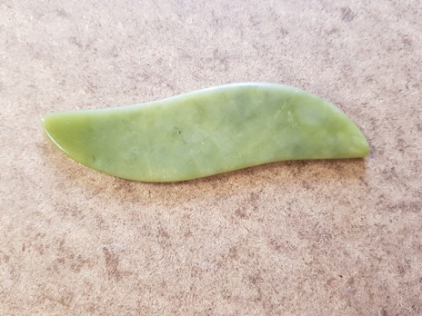 Kamenná guasha ve tvaru vlnky. Můžete "bříškem" škrabat a přejíždět po kůži nebo rohem tlačit do akupunkturních bodů kolem kostí a kloubů nebo nehtů. V praxi velmi využívaná pomůcka. Můžete ji použít 2 - 5x denně, podle problému a podle potřeby. Materiálem je nefrit.